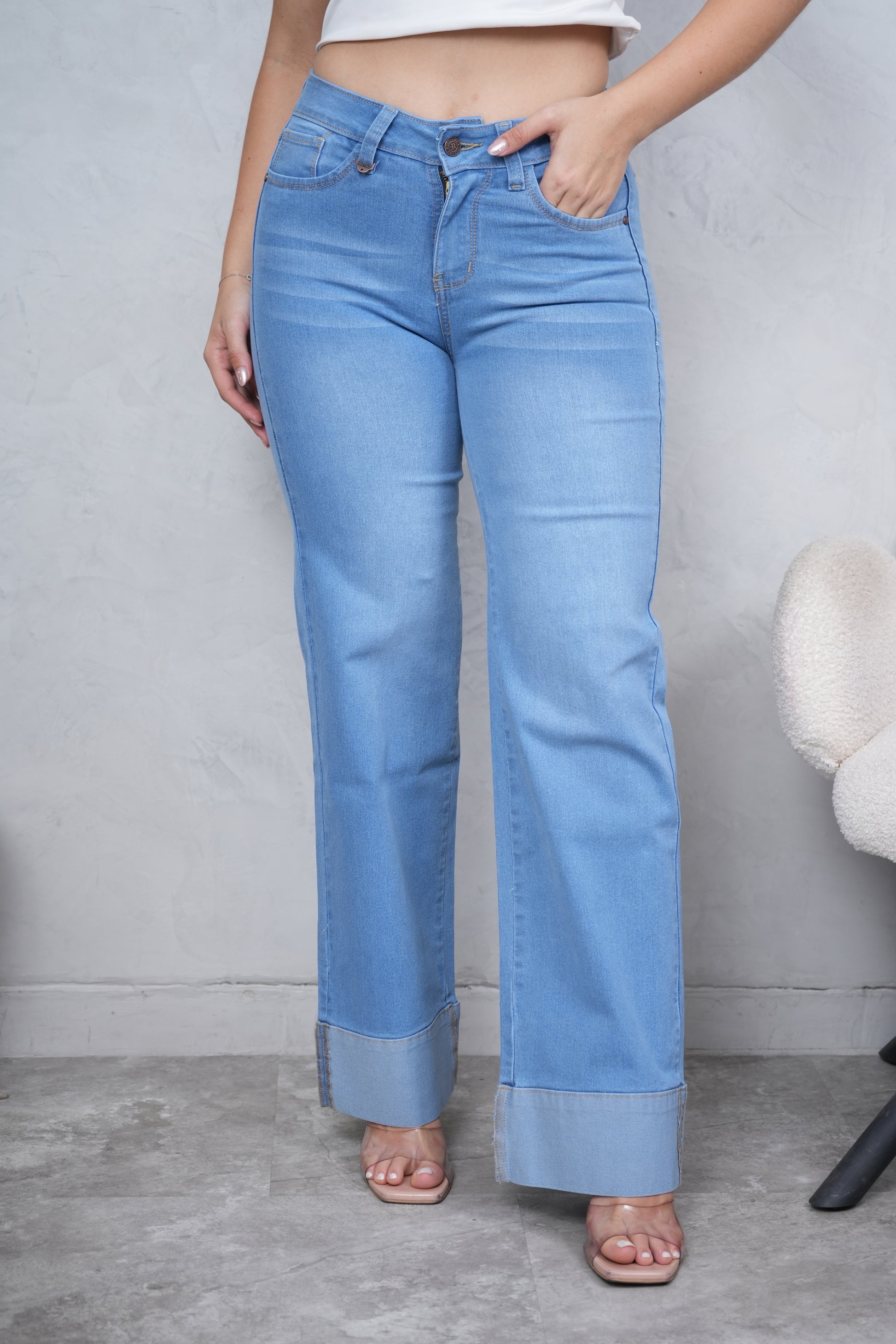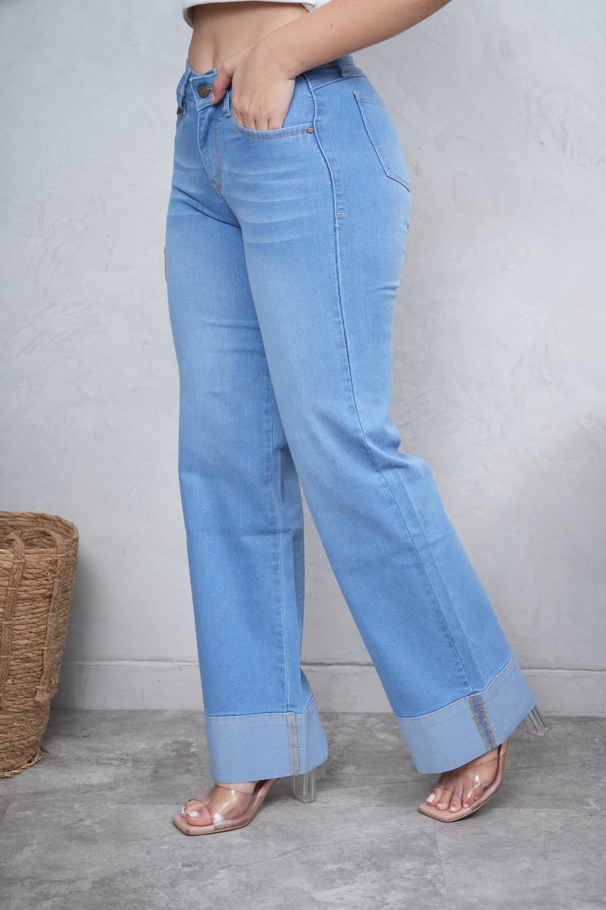 Jean wide leg tipo palazo, de talle a la cintura con un botón. Confeccionado en tejido plano de algodón con spandex, que brinda suavidad y libertad de movimiento.